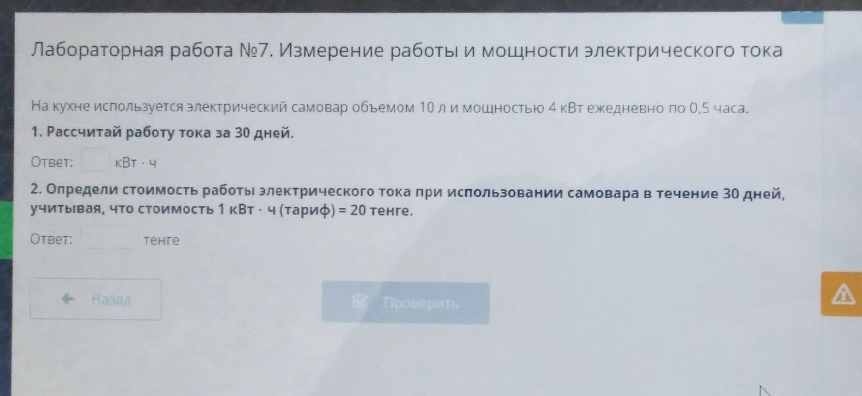 Лабораторная работа No7. Измерение работы и мощности электрического тока На кухне используется электрический самовар объемом 10 ли мощностью 4 кВт ежедневно по 0,5 часа. 1. Рассчитай работу тока за 30 дней. Ответ: кВт. Ч 2. Определи стоимость работы электрического тока при использовании самовара в течение 30 дней, учитывая, что стоимость 1 кВт - ч (тариф) = 20 тенге. Ответ: тенге