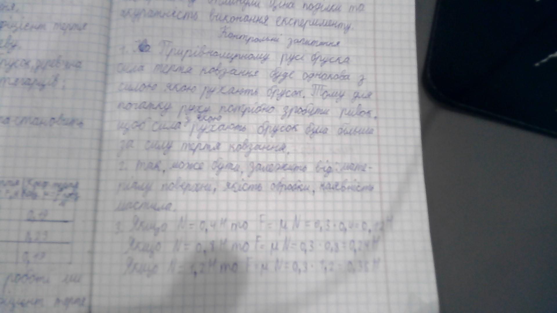 1. Чому у всіх дослідах необхідно пересувати брусок рівномірно? Чому при початку руху завжди відбувається ривок? 2. Чи може коефіцієнт тертя бути більший одиницю? 3. Брусок масою 200 г лежить на столі. Коефіцієнт тертя між столом і бруском складає 0,3. Яка сила тертя діє на брусок, якщо до нього прикладали сили: 0,4 Н; 0,8 Н;B 1,2 Н.