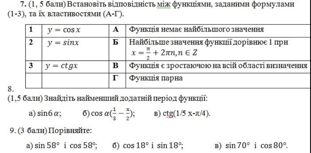 1. Якщо а є [0°; 90°], то функція sin a зростає, а cos a – зменшується. Значить, зі збільшенням аргументу синус на цьому відрізку все більше, а косинус все менше. Якщо 45° < а° < 90, то значення косинуса дедалі більше прагне нулю, а синуса - до одиниці. Тож у разі sin a > cos a, тобто sin 58 ° > cos 58 °.