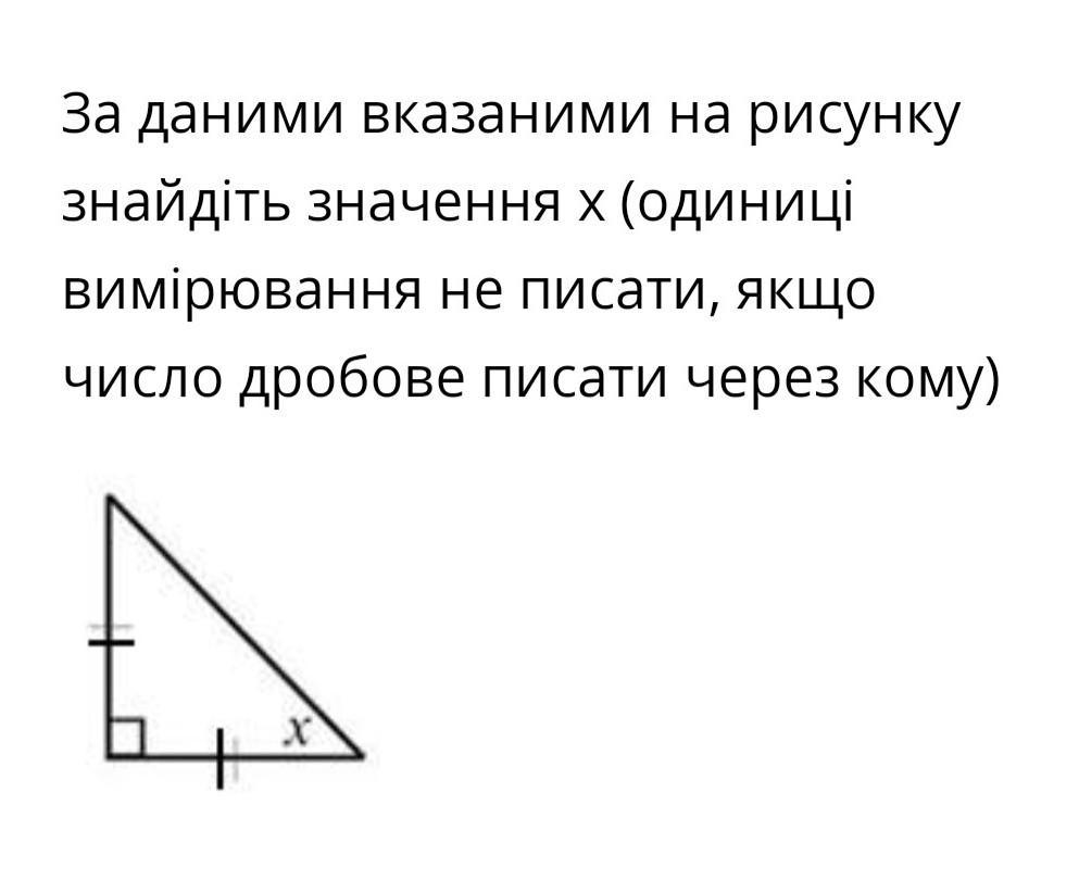 то х=45 гр. тому що прямокутний трикутник з однаковими катетатами. Сума катетів =90 гр, тому один із них =45