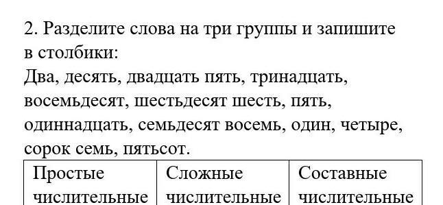 Разделите слова на три группы и запишите в столбики: Два, десять, двадцать пять, тринадцать, восемьдесят, шестьдесят шесть, пять, одиннадцать, семьдесят восемь, один, четыре, сорок семь, пятьсот. Простые числительные Сложные числительные Составные числительные ПОМОГИТЕ СОР 5 КЛАСС РУСС ЯЗ