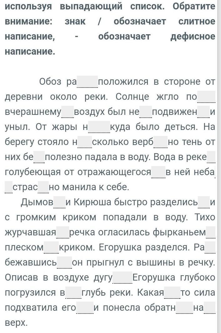 Расположился; по-вчерашнему; неподвижен; некуда; несколько; вербов; бесполезно. Вода в реке, голубеющая от отражающегося в ней неба, страстно манила к себе. Дымов и Кирюша быстро разделись и с громким криком попадали в воду. Тихо журчавшая речка согласилась фырканьем, плеском и криком; Разбежавшись, он прыгнул с вершины в речку. Описав в воздухе дугу, Егорушка глубоко погрузился вглубь реки. Какая-то сила подхватила его и понесла обратно наверх.
