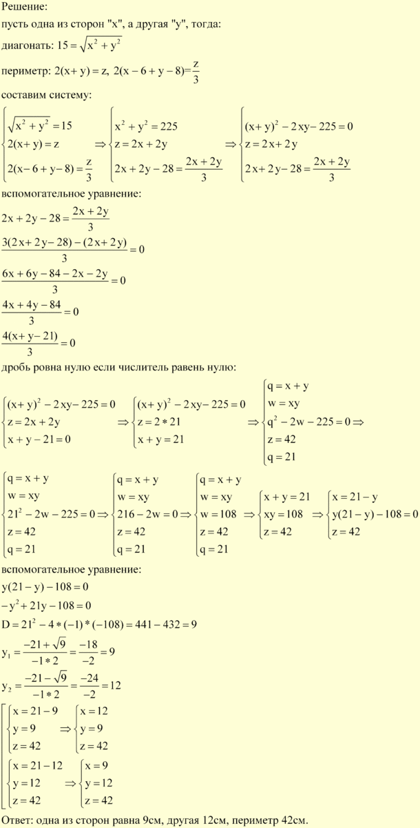 Тема: "Система рівнянь. Розв'язування задач."Діагональ прямокутника дорівнює 15 см. Якщо одну з його сторін зменшити на 6 см, а другу на 8 см, то периметр зменшується в 3 рази. Знайти сторони прямокутника.
