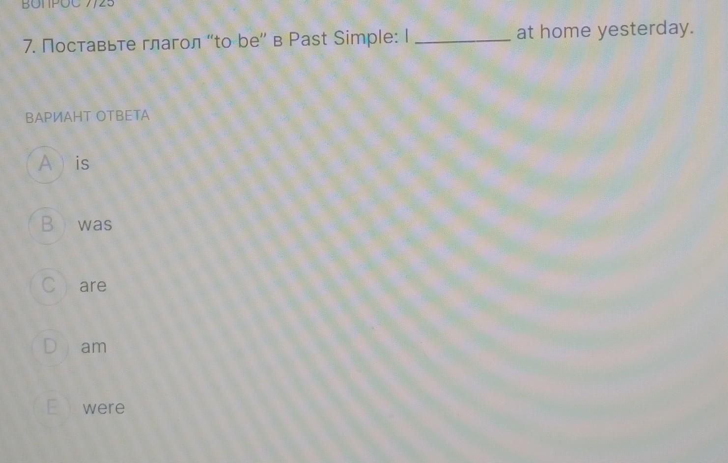 BOMPOC 7/25 7. Moctabute tharon "to be" B Past Simple: at home yesterday. ВАРИАНТ ОТВЕТА A is B was are am E were