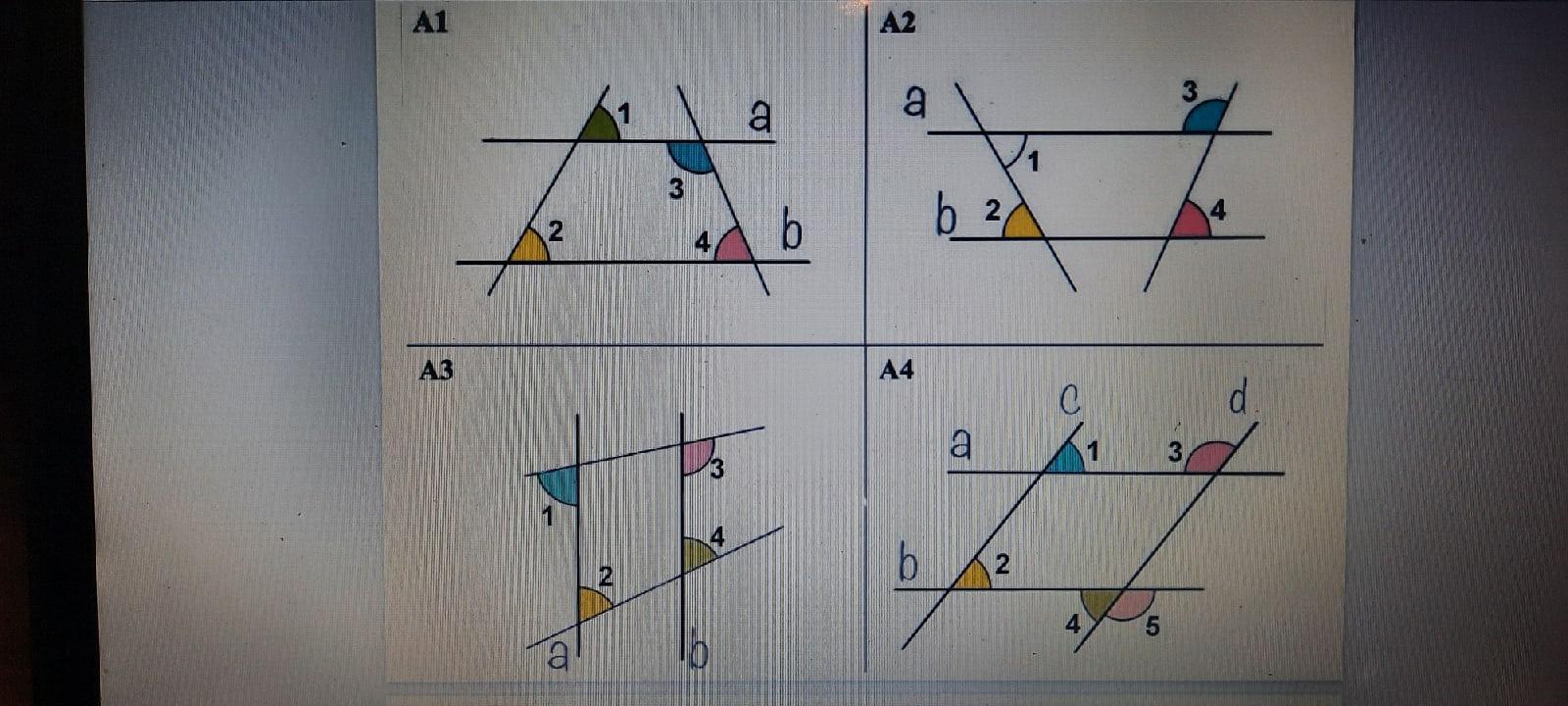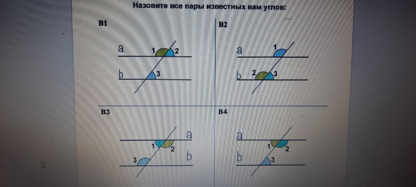 на картинке В1 2 и 3 угол это соответсвенные углына картинке В2 1 и 3 это внешние накрест лежащие углына картинке В3 углы 1 и 3 внутренние односторонние на картинке В4 углы 2 и 3 внутренние односторонние