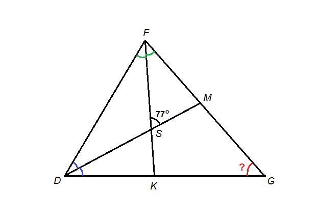 В треугольнике DFG DFG биссектрисы DM и FKпересекаются в точке S Найди значение угла G если ∠FSM=77°.