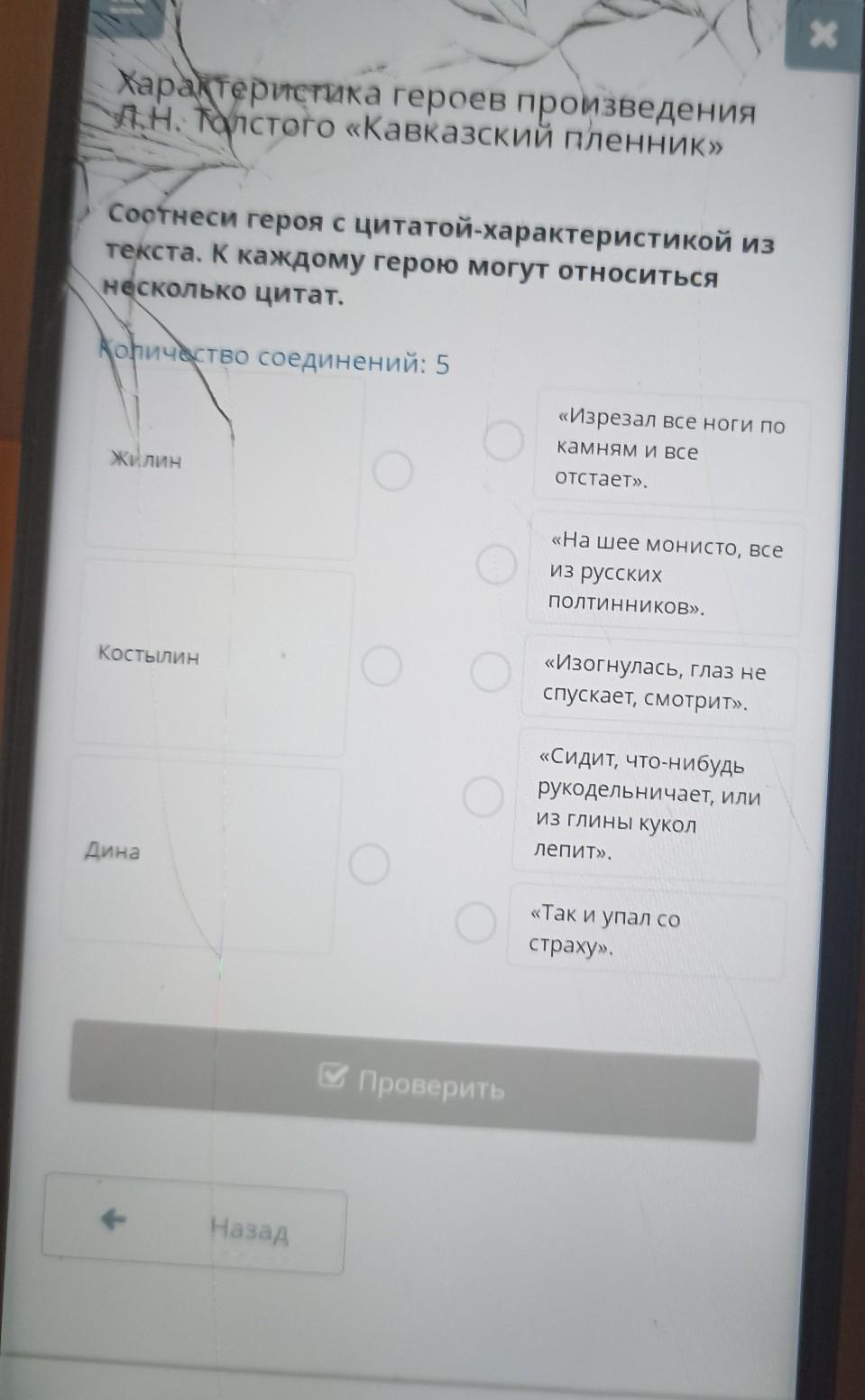 Соотнеси героя с цитатой-характеристикой из текста. К каждому герою могут относиться несколько цитат. Количество соединений: 5 «Изрезал все ноги по камням и все жилин отстает». «На шее монисто, все из русских полтинников». Костылин «Изогнулась, глаз не спускает, смотрит», «Сидит, что-нибудь рукодельничает, или из глины кукол лепит», Дина «Так и по со