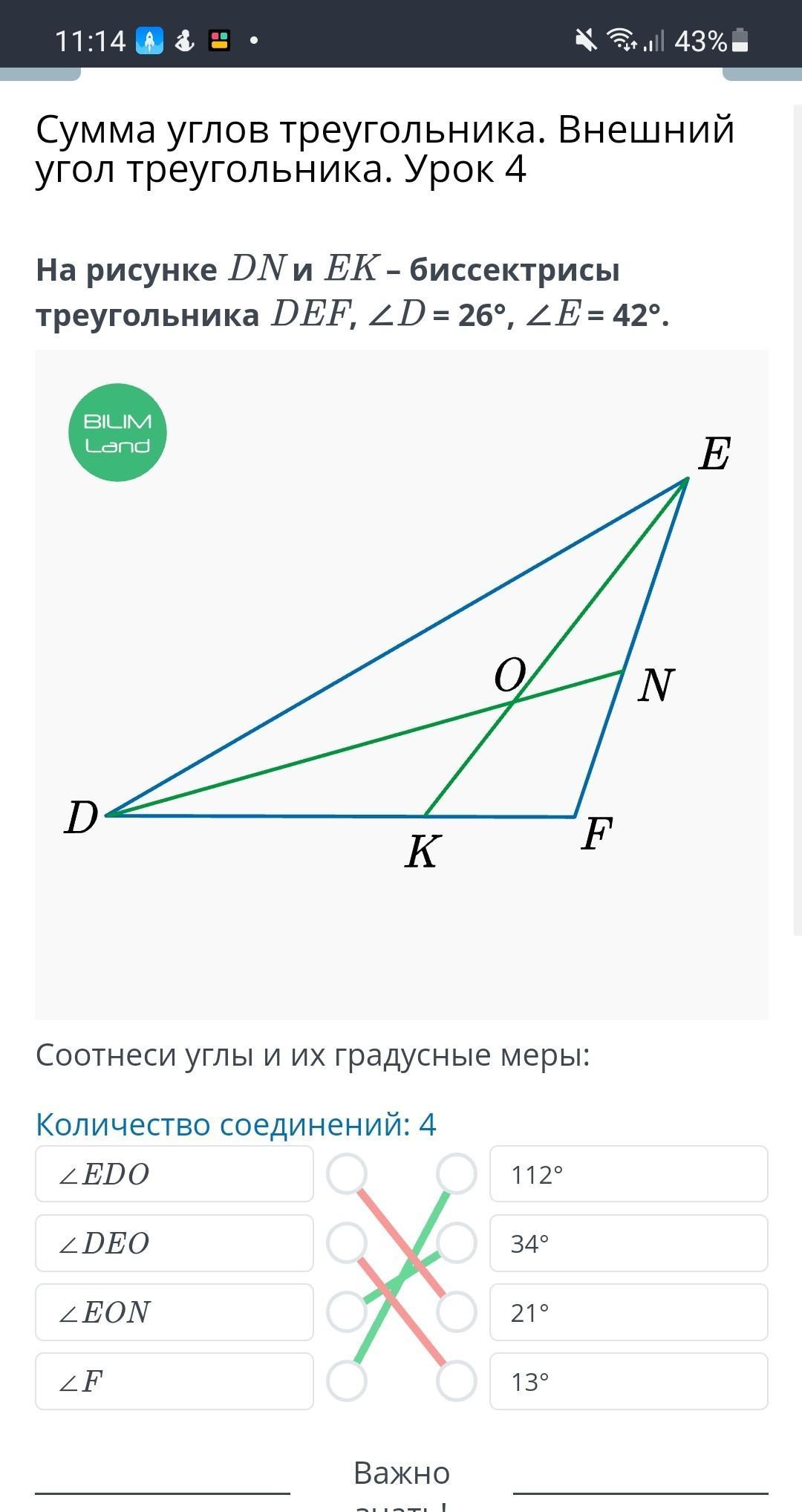 Внешний угол треугольника. Урок 4 На рисунке DN и EK – биссектрисы треугольника DEF, ∠D = 26°, ∠E = 42°.
