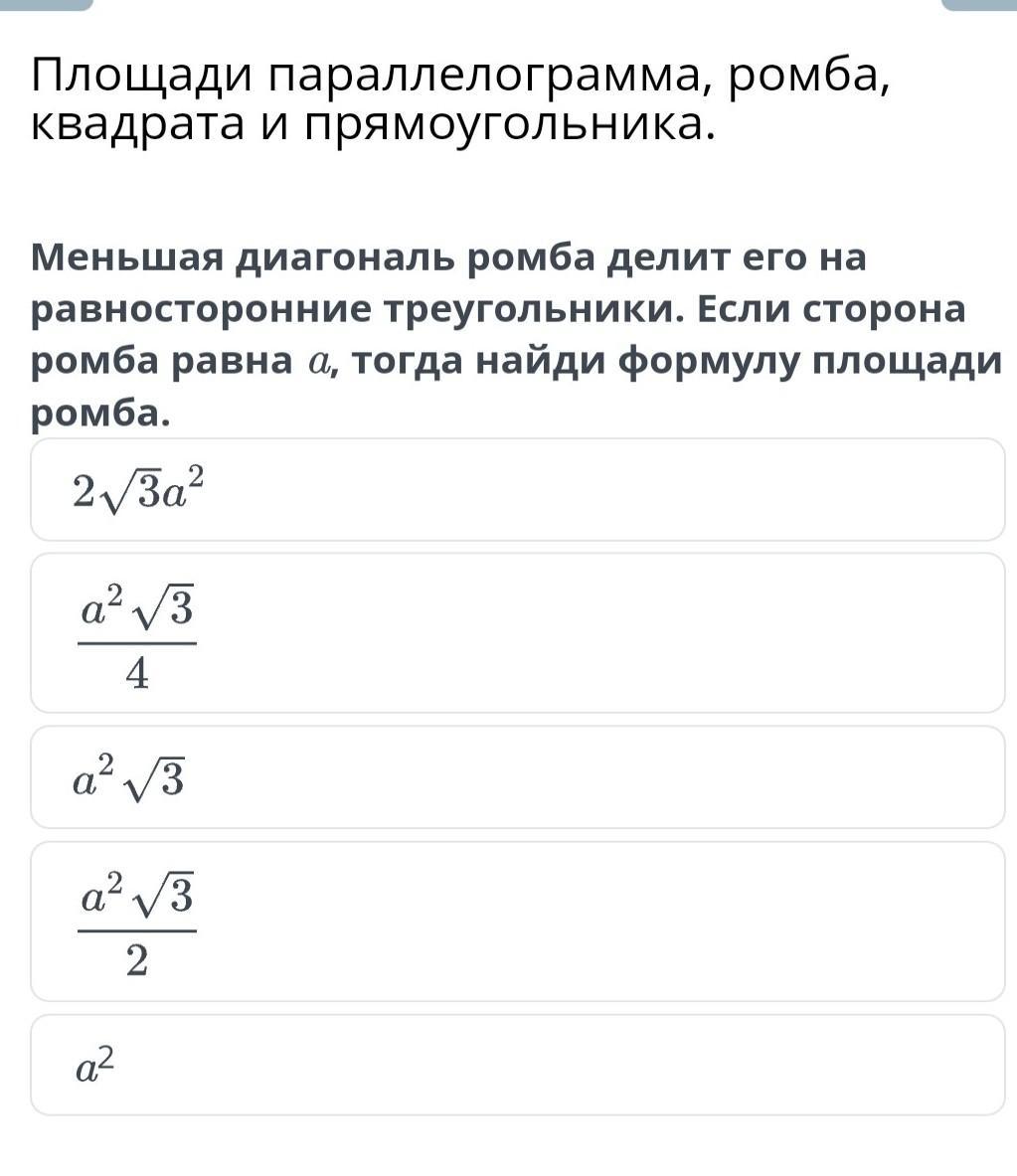 Площади параллелограмма, ромба, квадрата и прямоугольника. Меньшая диагональ ромба делит его на равносторонние треугольники. Если сторона ромба равна а, тогда найди формулу площади ромба. Помогите пожалуйста