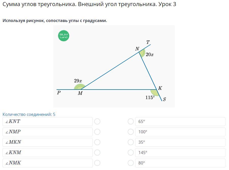 Таким образом, ∠KNM= 180° - ∠KNT = 180° - 100° = 80°, a ∠NMK = 180° - ∠NMP = 180° - 145° = 35°.