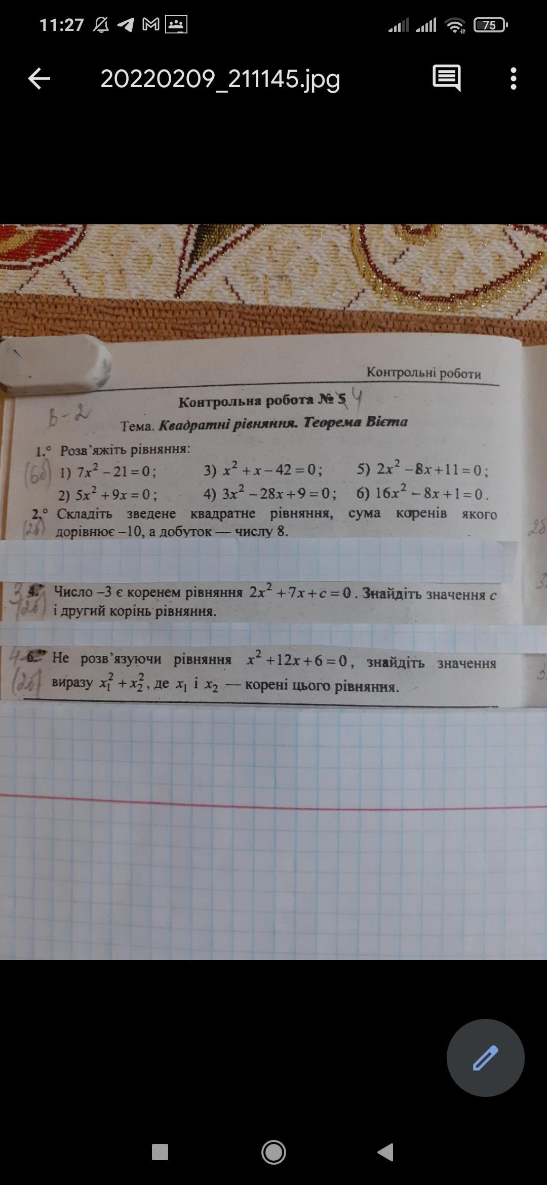 Завдання 1: 1) 7х^2-21=0; 7х^2=21; х^2=21/7; х^2=3; х=±√3