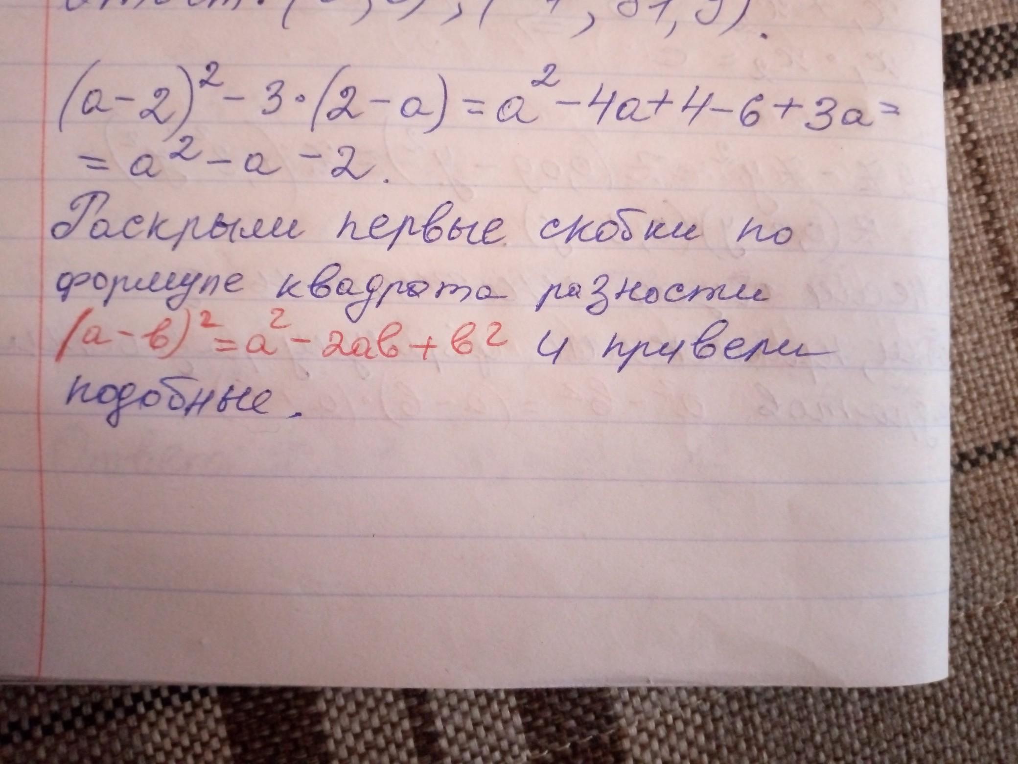 если надо было упростить выражение ,то решение на фотографии .если надо было разложить выражение на множители ,то решение такое: (a-2)²-3(2-a)=(а-2)²+3(а-2)=(а-2)(а-2+3)=(а-2)(а+1).