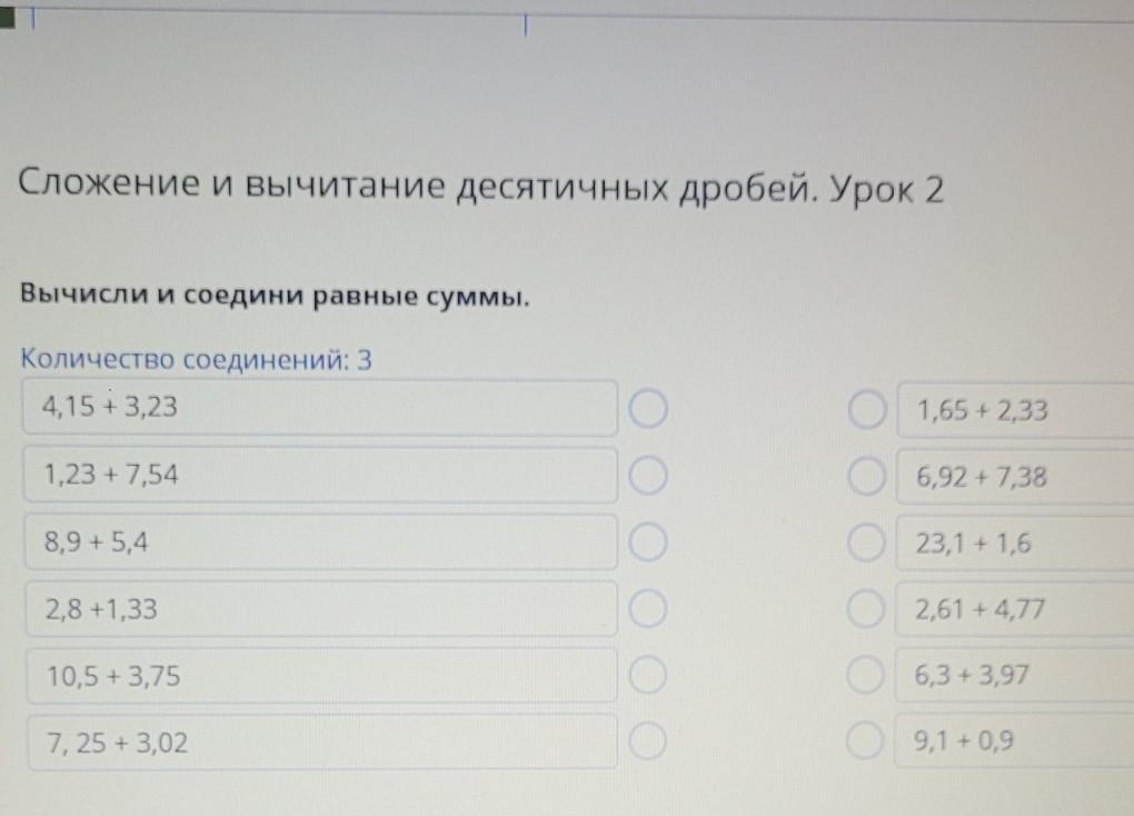 X Сложение и вычитание десятичных дробей. Урок 2 Вычисли и соедини равные суммы. Количество соединений: 3 4,15 + 3,23 1,65 + 2,33 1,23 +7,54 6,92 + 7,38 8,9 + 5,4 23,1 + 1,6 + 2,8 +1,33 2,61 + 4,77 10,5 + 3,75 6,3 + 3,97 7.25 +3.02 + 9,1 +0,9 - Назад 15:53 DVC