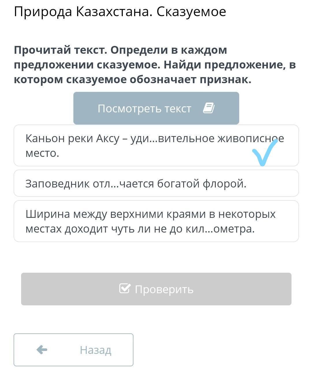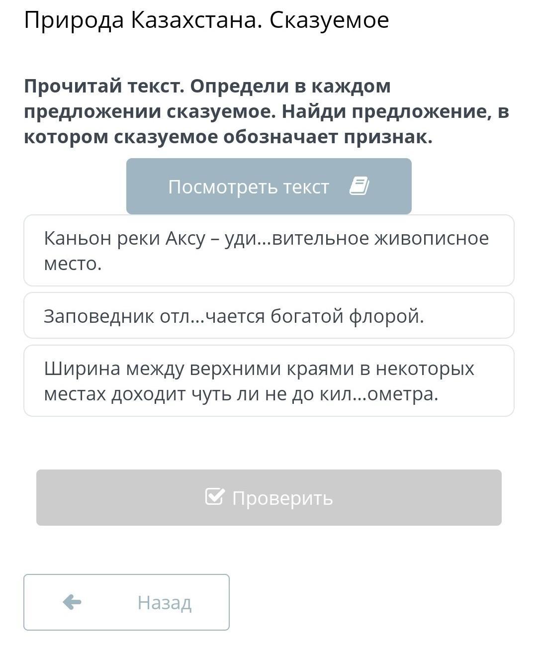 Природа Казахстана. Сказуемое Прочитай текст. Определи в каждом предложении сказуемое. Найди предложение, в котором сказуемое обозначает признак. Посмотреть текст Каньон реки Аксу – уди…вительное живописное место. Заповедник отл…чается богатой флорой. Ширина между верхними краями в некоторых местах доходит чуть ли не до кил…ометра.