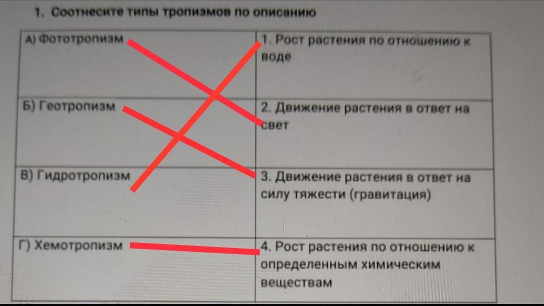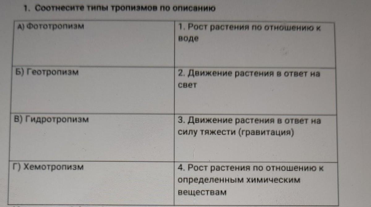 1. Соотнесите типы тропизмов по описанию А) Фототропизм 1. Рост растения по отношению к воде Б) Геотропизм 2. Движение растения в ответ на Свет B) Гидротропизм 3. Движение растения в ответ на силу тяжести (гравитация) П) Хемотропизм 4. Рост растения по отношению к определенным химическим веществам