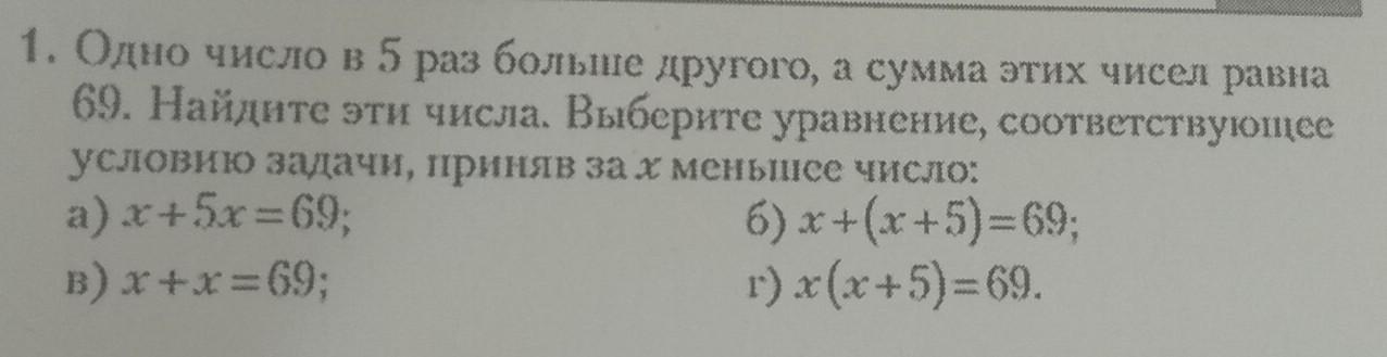 1. Одно число в 5 раз больше другого, а сумма этих чисел равна 69. Найдите эти числа. Выберите уравнение, соответствующее условию задачи, приняв зах меньшее число: