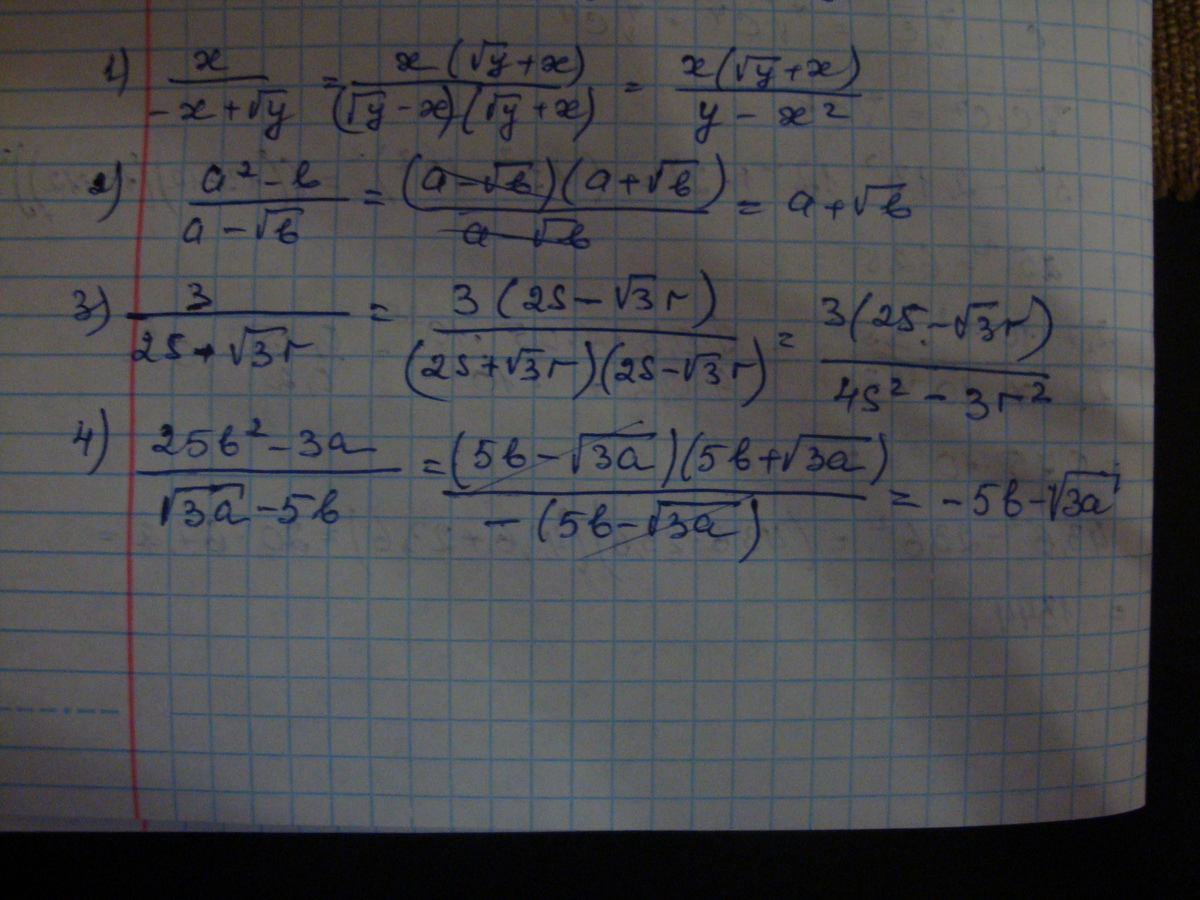 Ребят,помогите с алгеброй) надо освободить выражение от иррациональности в знаменателе....1)в числителе-х,в знаменателе-х+√у.....2)в числ-а²-b,в знамен-а-√b....3)в числ-3,в знамен-2s+√3r....4)в числ-25b²-3a,в знам-√3a-5...Помогите пожалуйста)