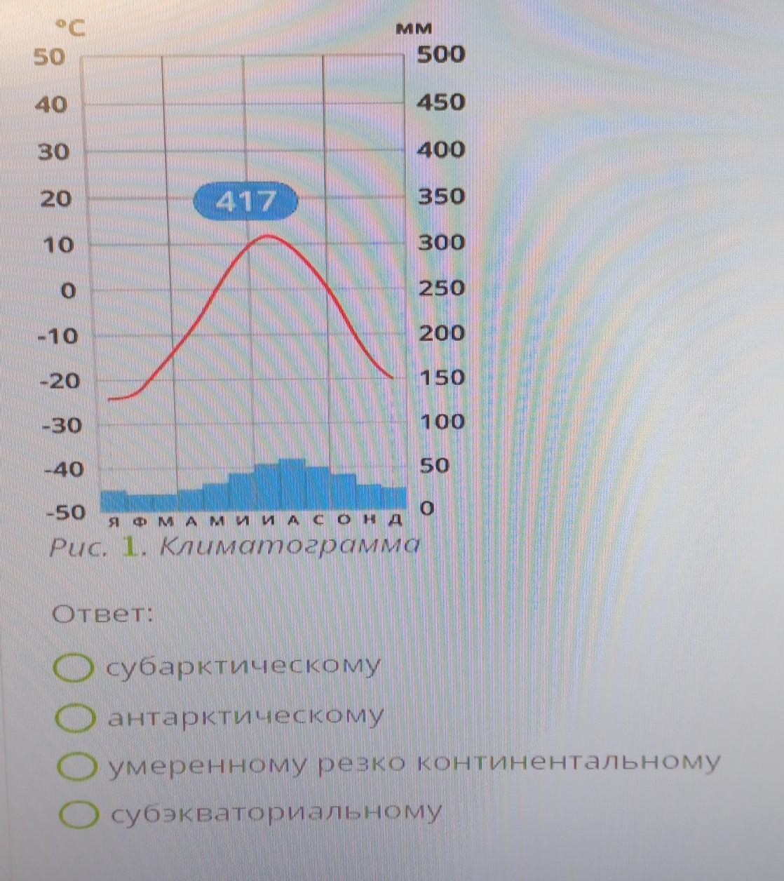 Определи, какому типу климата на территории России соответствует представленная климатограмма