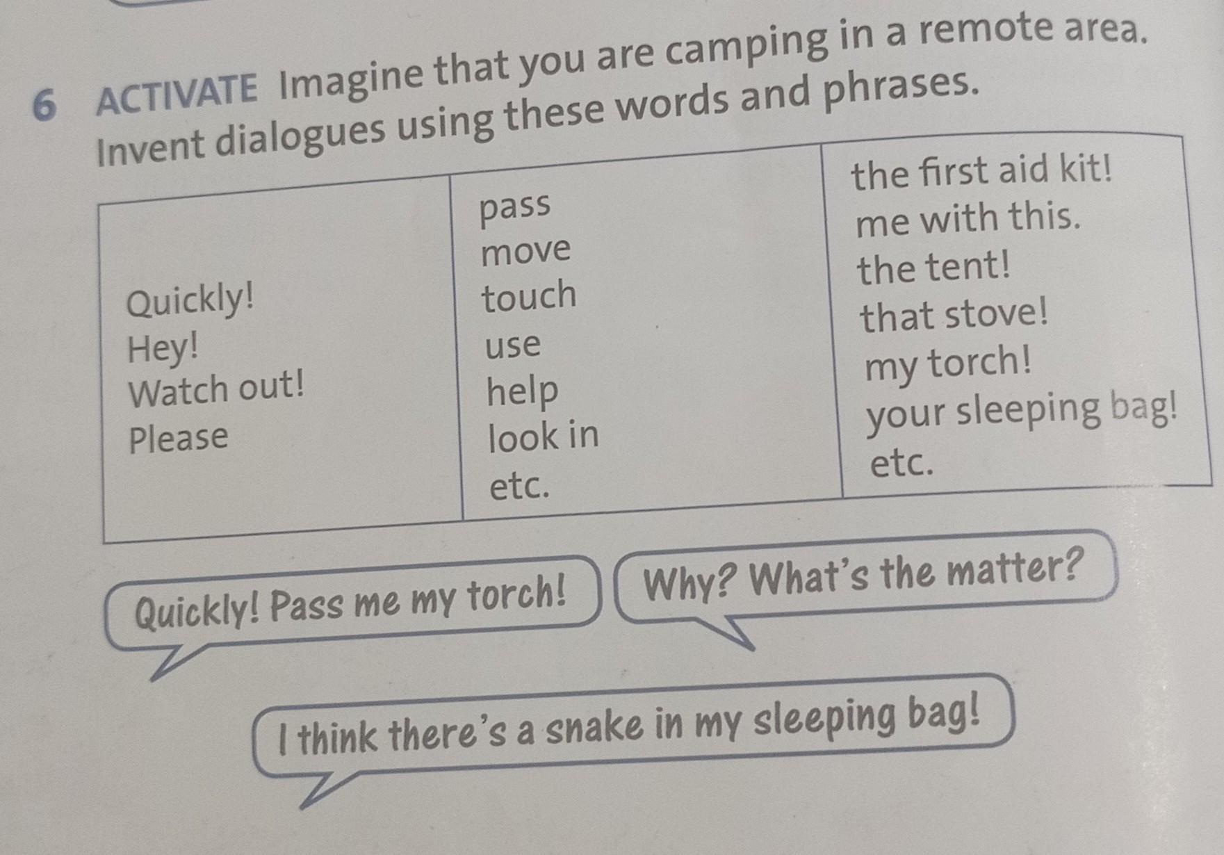 mountain biking a 6 ACTIVATE Imagine that you are camping in a remote area. Invent dialogues using these words and phrases. Quickly! Hey! Watch out! Please pass move touch use help look in etc. the first aid kit! me with this. the tent! that stove! my torch! your sleeping bag! etc. Quickly! Pass me my torch! Why? What's the matter? I think there's a snake in my sleeping bag! помогите
