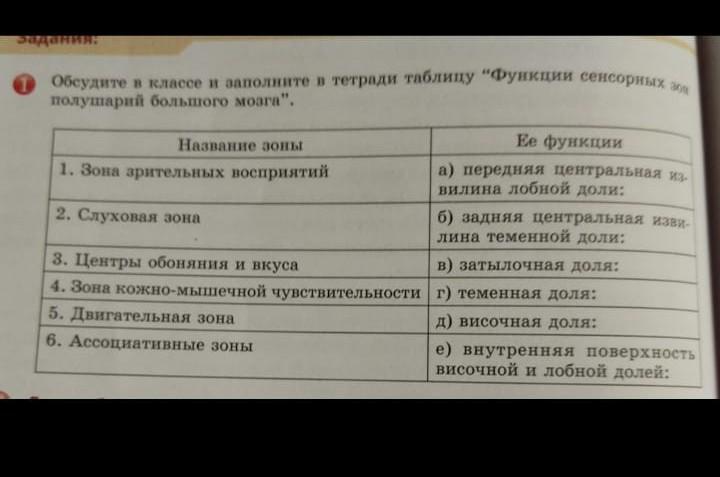 Задания: Обсудите полушарий большого мозга”. в классе и заполните в тетради таблицу “Функции сенсорных 1 Название зоны 1. Зона зрительных восприятий Ее функции а) передняя центральная и вилина лобной доли: б) задняя центральная из- лина теменной доли: в) затылочная доля: 2. Слуховая зона 3. Центры обоняния и вкуса 4. Зона кожно-мышечной чувствительности г) теменная доля: 5. Двигательная зона 6. Ассоциативные зоны д) височная доля: е) внутренняя поверхность височной и лобной долей: