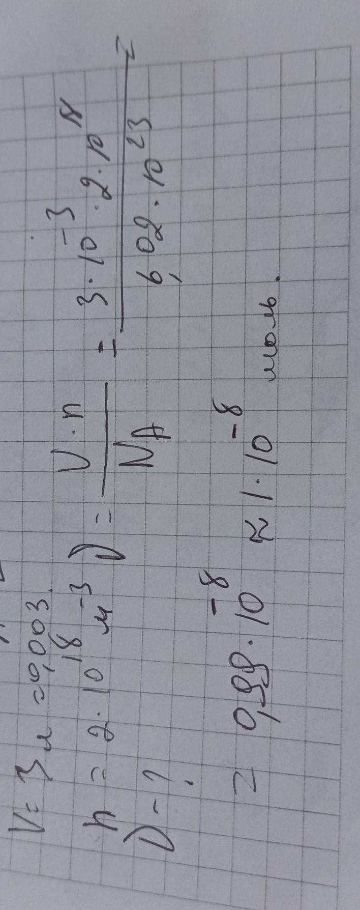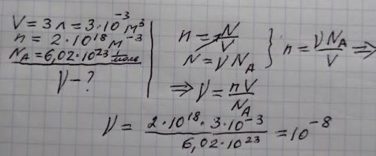 Визначити кількість речовини водню, що заповнює посудину об'ємом V=3 л, якщо Концентрація молекул газу в ній n=2*10^18 м^-3