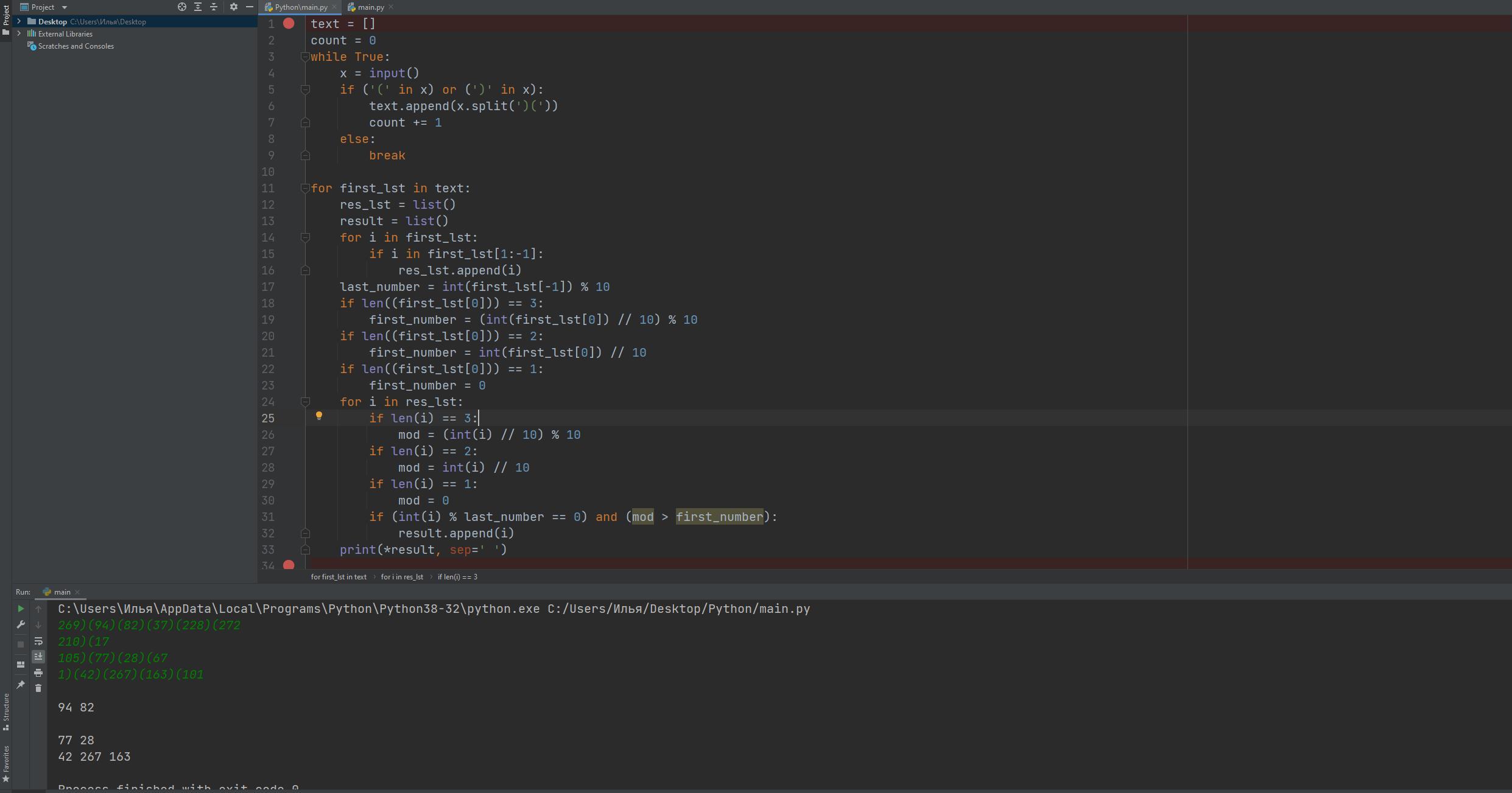 а В Анк Морпорк пришла весна. Птицы вили гнезда среди водосточных труб и карнизов Незримого Университета, хотя необходимо отметить: Как бы велика ни была нехватка мест для гнездования, ни одна птица ни разу не устроила гнездо в зазывно открытых ртах выстроившихся вдоль крыши горгулий-водометов - к большому разочарованию последних. Напишите программу для выбора мест гнездования, а именно чисел, кратных последней цифре последнего числа в строке и имеющих больше десятков, чем десятков в первом числе в строке. Формат ввода Вводятся строки чисел, записанных через )(. Формат вывода Из каждой строки выбрать подходящие числа и вывести их в порядке ввода через пробел. Первое и последнее числа в рассмотрении не участвуют.