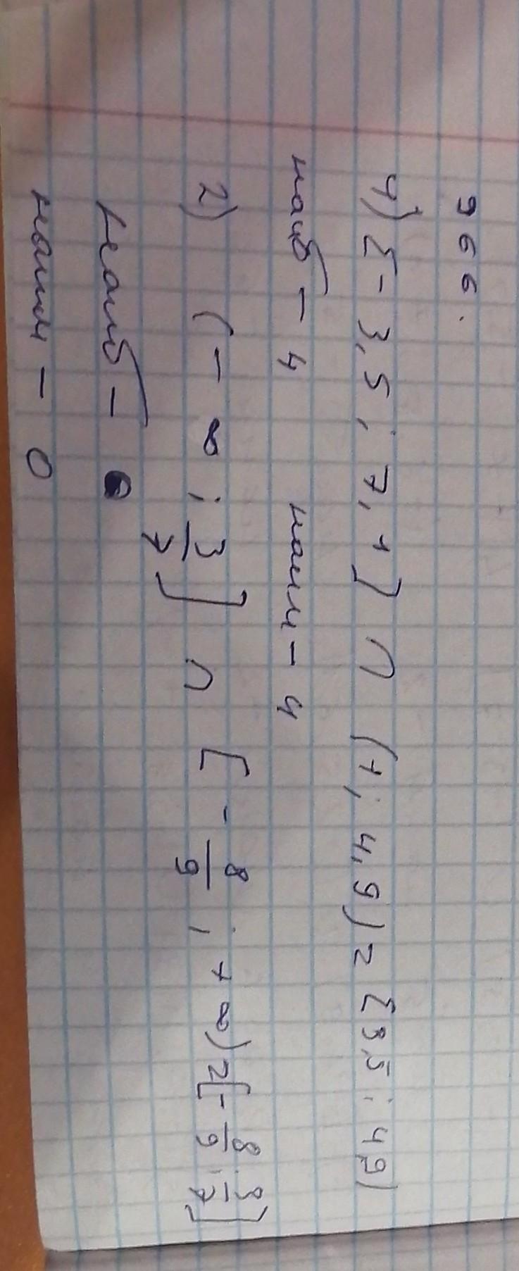 966. Найдите наибольшее (наименьшее) целое число, принадлежа- щее пересечению числовых промежутков: 3 8. 1) [3,5; 7,1] 1 (1; 4,9); и 3) (-00; +оо) и -7-38 4) (-5,1; 9,1) 1 (-00; too).