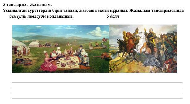 5-тапсырма. Жазылым.Ұсынылған суреттердің бірін таңдап, жазбаша мәтін құраңыз. Жазылым тапсырмасында демеулік шылауды қолданыңыз.