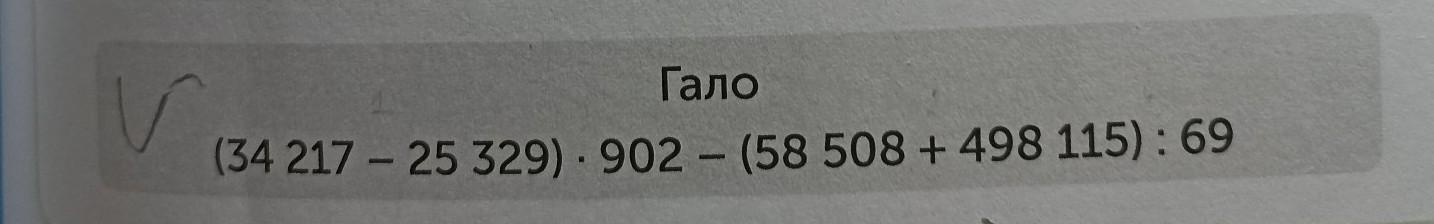 Ответ: (34 217 - 25 329) * 902 - (58 508 + 498 115) : 69 = 8 008 909