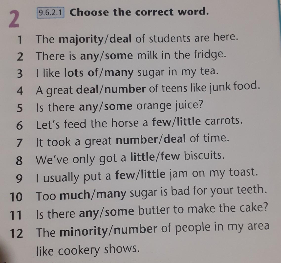 9.6.2.1 Choose the correct word. 2. 1 The majority/deal of students are here. 2 There is any/some milk in the fridge. 3 I like lots of/many sugar in my tea. 4 A great deal/number of teens like junk food. 5 Is there any/some orange juice? 6 Let's feed the horse a few/little carrots. 7 It took a great number/deal of time. 8 We've only got a little/few biscuits. iem mtot
