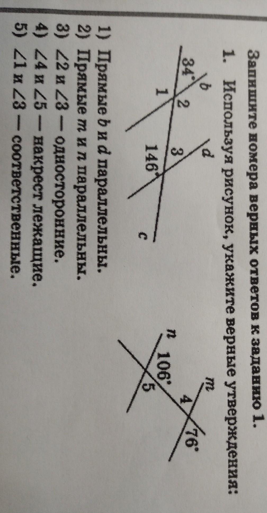 1. Используя рисунок, укажите верные утверждения: d 16" 34 4 2 3 п Baneda 1 1069 5 146 1) Прямые би d параллельны. 2) Прямые тип параллельны. 3) 22 и 23 - односторонние. 4) 24 и 25 — накрест лежащие, 5) 21 и 23 — соответственные.