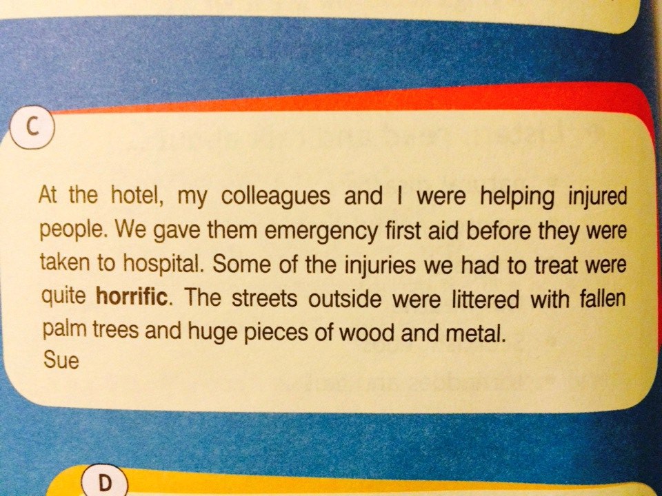С. В отеле, мои коллеги и я помогали раненным людям. Мы оказывали первую помощь до того пока они попадали в госпиталь. Некоторых раненных нам приходилось лечить ужасно быстро. Улица снаружи были замусоренными пальмами и большими кусками деревьев и метала.