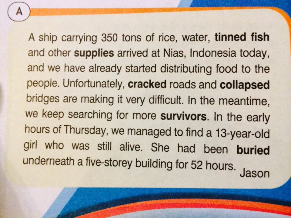 А. Корабль перевозил 350 тонн риса, воды и рыбных консерв и другие предметы снабжения прибывал сегодня в Ниас, Индонезия и мы уже начинали распределять еду людям. К сожалению, ужасные дороги и рухнувший мост сделали это очень затруднительным. Тем временем мы продолжали искать выживших. В ранние часы четверга нам удалось найти 13 летнею девочку, которая осталась жива. Она была похоронена под пятиэтажным домом 52 часа.