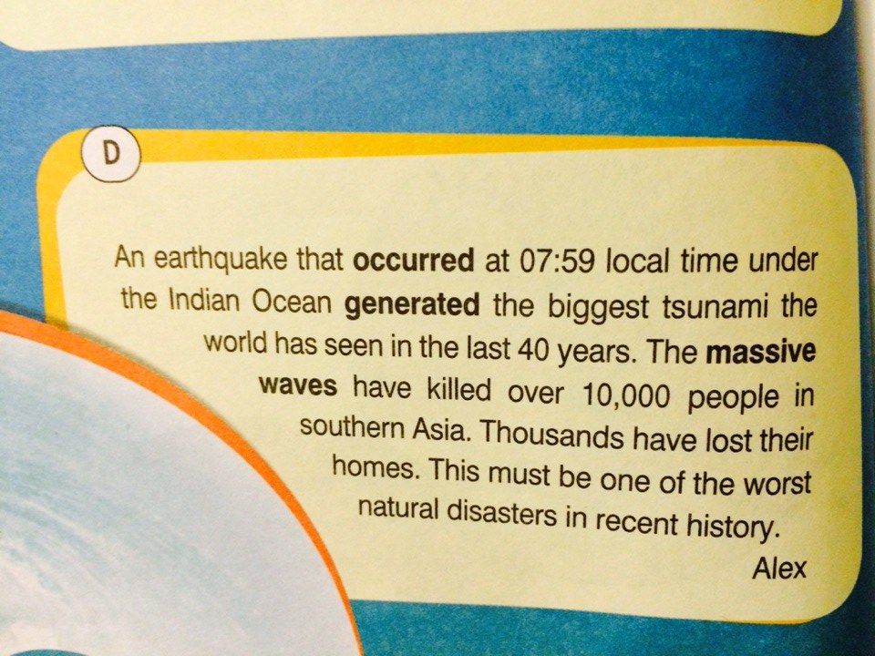 D. Землетрясение произошло в 7.59 по местному времени в Индийском Океане и создало гигантское цунами в мире за последние 40 лет. Огромные волны убили более 10 тысяч человек в южной Азии. Тысячи потеряли свои дома. Это одна из самых ужасных природных катастроф в Новейшей истории.