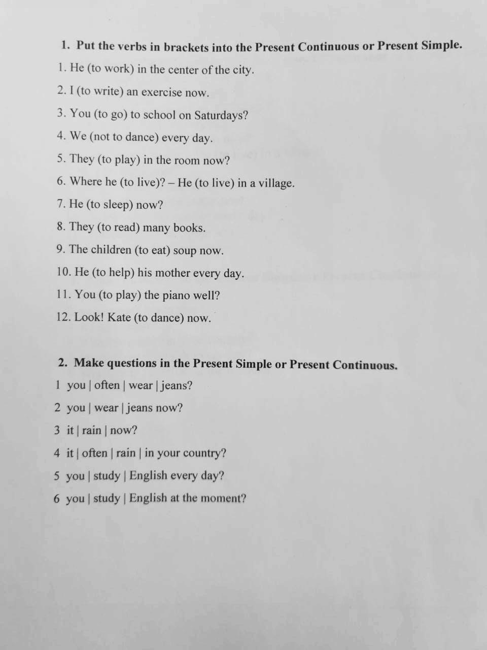 Помогите пожалуйста. Даю 35 баллов. Надо расставить скобки в 1,во 2 составить вопросы и выбрать это Present Simple или Present Continues