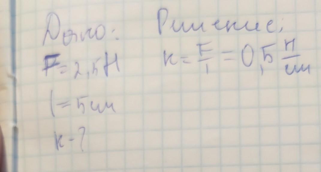 під час проведення експериментального дослідження на визначення жорстокості пружини, Уляна з Микитою записали, що під дією сили 2,5 Н пружина видовжилася на 5 см. яку жорстокість має пружина?