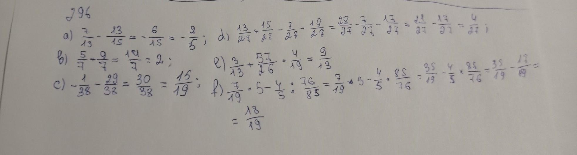 296.Вычислите а)7/15-13/15 b)5/7+9/7 c)-1/38-29/38 d)13/27+15/27-7/27-17/27 e)3/13+57/26•4/19 f)7/19•5-4/5:76/85. ЕСЛИ КТО-ТО РЕШИТ КАК НАДО С РЕШЕНИЕ ПО МАТЕМАТИКЕ ТОМУ 5,0 БАЛОВ ДАМ