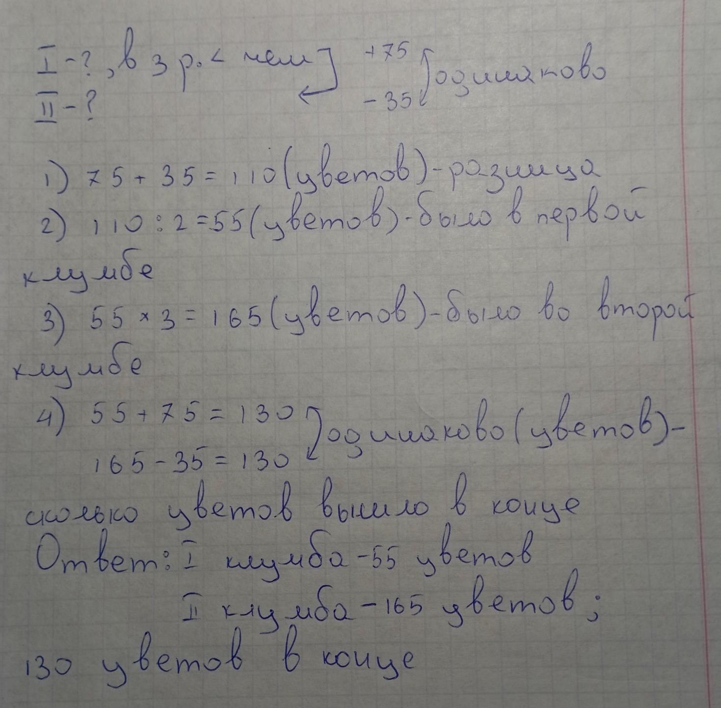 В первой клумбе было в 3 раза меньше Цветов, чем во второй. Когда в первую клумбу посадили 75 цветов, а из второго Взяли 35, то в обеих клумбах цветов стало поровну. Сколько цветов было в каждой клумбе?