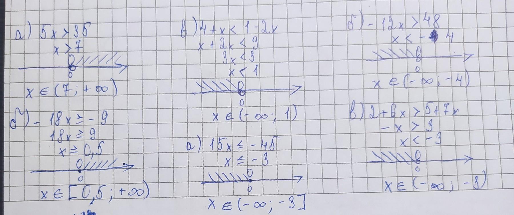Решите неравенство. а) 5х > 35 а) 15х ≤ -45 б)-18х ≥ -9 б) -12х > 48 в) 4+х < 1-2х в) 2+6х > 5+7х