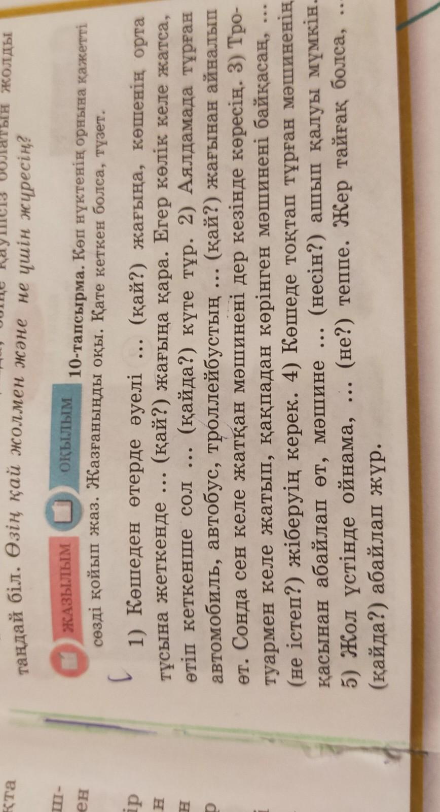 ЖАЗЫЛЫМ ОҚЫЛЫМ 10-тапсырма. Көп нүктенің орнына қажетті . сөзді қойып жаз. Жазғаныңды оқы. Қате кеткен болса, түзет.