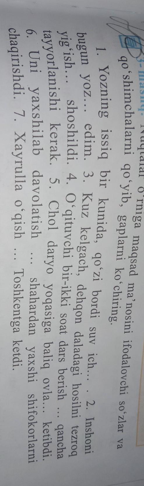 Nuqtalar orniga maqsat manosini ifodalochi sozlar va qoshimchalarini qoyib gaplarni kochiring