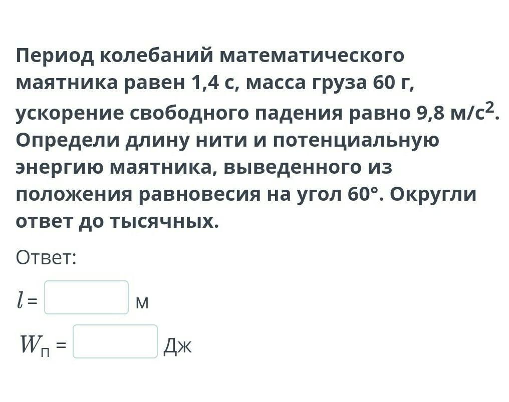 Период колебаний математического маятника равен 1,4 с, масса груза 60 г, ускорение свободного падения равно 9,8 м/с2. Определи длину нити и потенциальную энергию маятника, выведенного из положения равновесия на угол 60°. Округли ответ до тысячных.