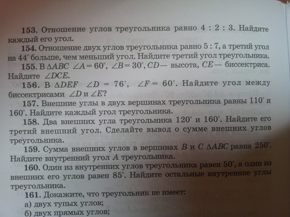 известно, что сумма внутреннего и внешнего углов равна 180 гр, так как один из внешних углов равен 110, то внутренний равен 180 - 110, т.е. 70 градусам; второй внешний угол равен 160, значит, внутренний равен 180 - 160, т.е. 20 градусам.