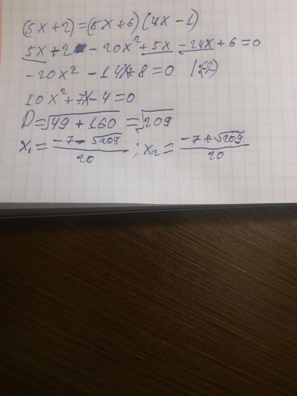 проверь правильно ли написано условие уравнения. В любом случае, я решил ЭТО 5х+2 = (5x+6)(4x-1)