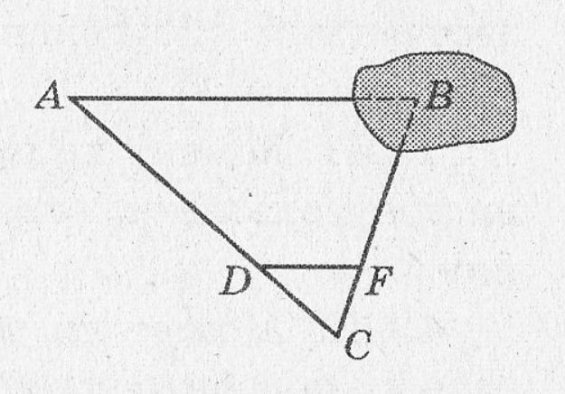 Чтобы определить на местности расстояние АВ между двумя точками, одна из которых В недоступна, можно выполнить построения, план которых показан на рисунке. Найдите расстояние АВ, если АС = 150 м, DF||АВ, DF = 16 м, CD = 30 м.