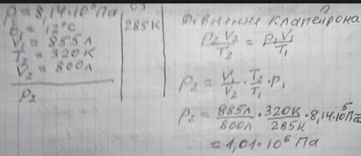 Газ при тиску 8,14×10⁵ Па і температурі 12°С займає об'ем 855 л. Яким буду тиск, якщо маса газу при температурі 320 K займає об'єм 800 л?