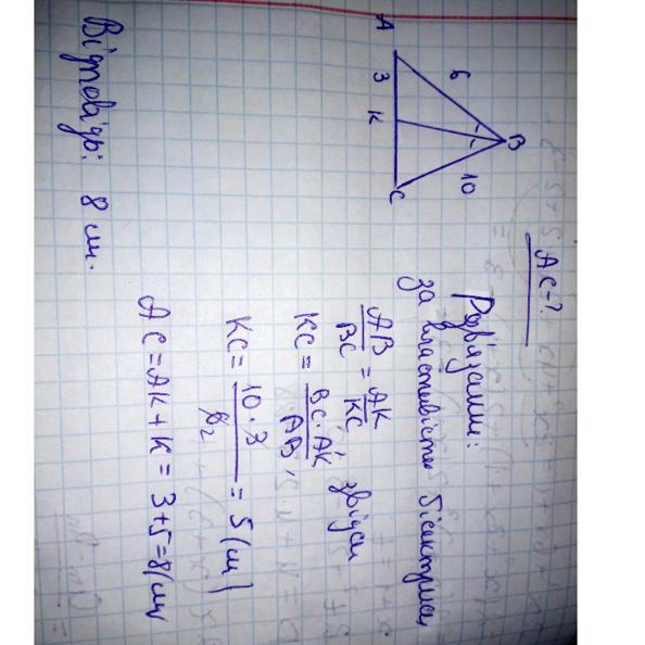 АВ - бісектриса трикутника АВС, АВ = 6 см, ВС = 10 см. Менший з відрізків, на які бісектриса ВК ділить сторону АС, дорівнює 3 см. Знайдіть АС