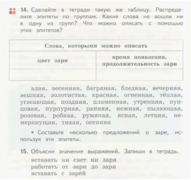 Ответ:Номер14первый столбик: алая, богрянная и т.д. (прилогательные характеризующие зарю)