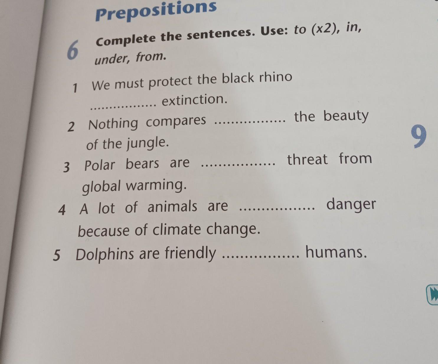 6 Complete the sentences. Use: to (x2), in, under, from 1 We must protect the black rhino .... extinction. 2 Nothing compares ... ...... the beauty of the jungle 3 Polar bears are threat from global warming 4 A lot of animals are .... danger because of climate change. 5 Dolphins are friendly ................. humans. .
