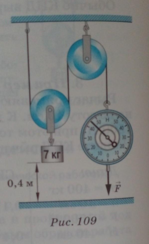 Определите полезную работу, совершённую при подъёме груза на высоту 0,4 м (рис. 109). Какую полную работу пришлось совершить? Вычислите КПД установки.